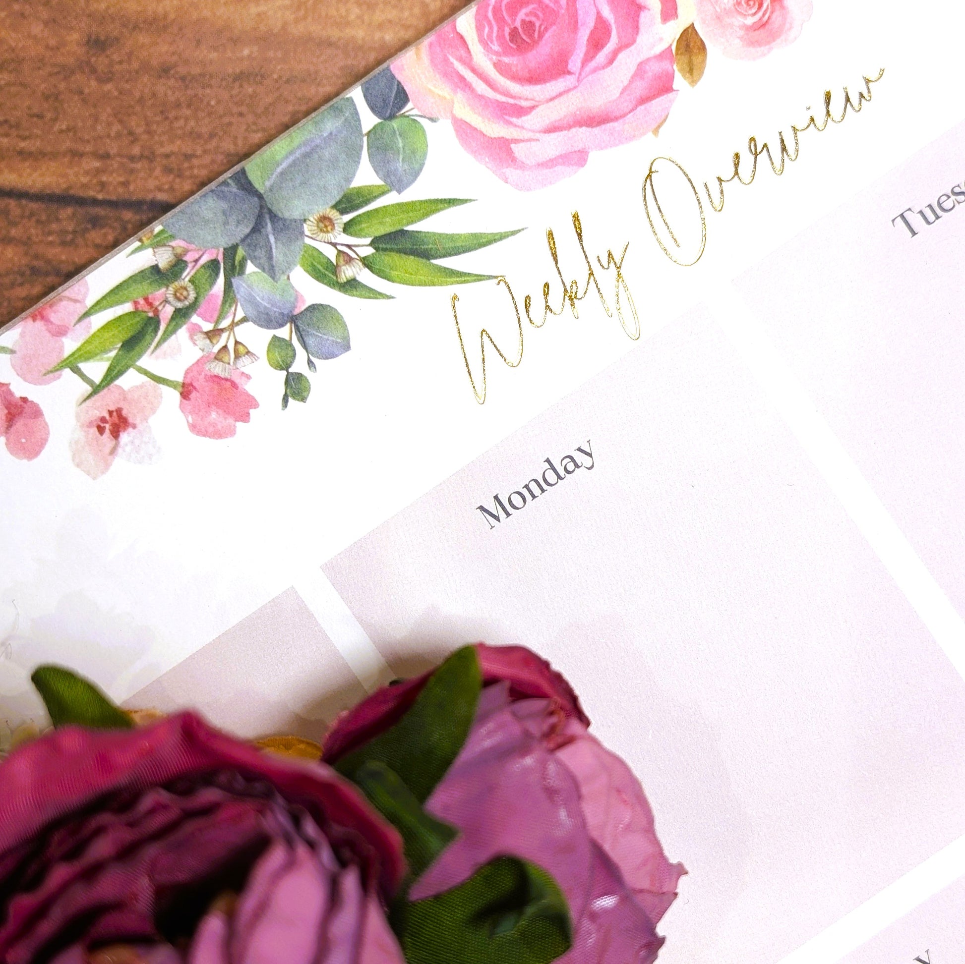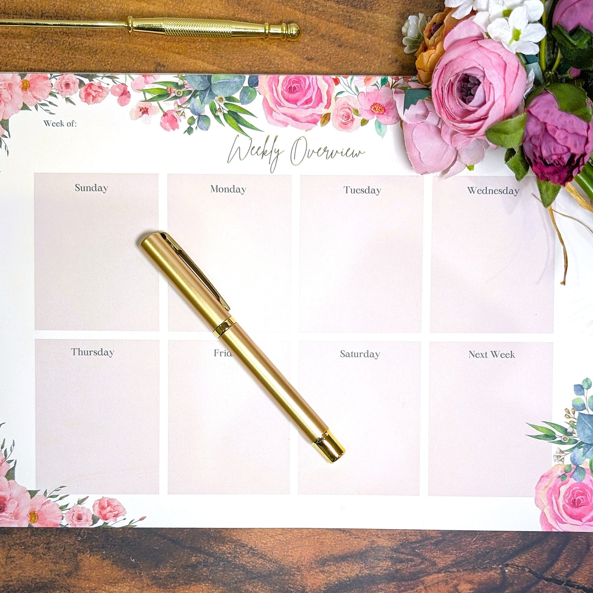 Crafted from high quality, 120 gsm, cream colored paper, each page of this pad is adorned with our unique floral and foliage design. The 55 glue-bound sheets ensure that you have a sheet for each week of the year (plus a few extra). Its gilded edges and gold foil text add a touch of luxury to your space while taking nothing away from the practicality of this planner.