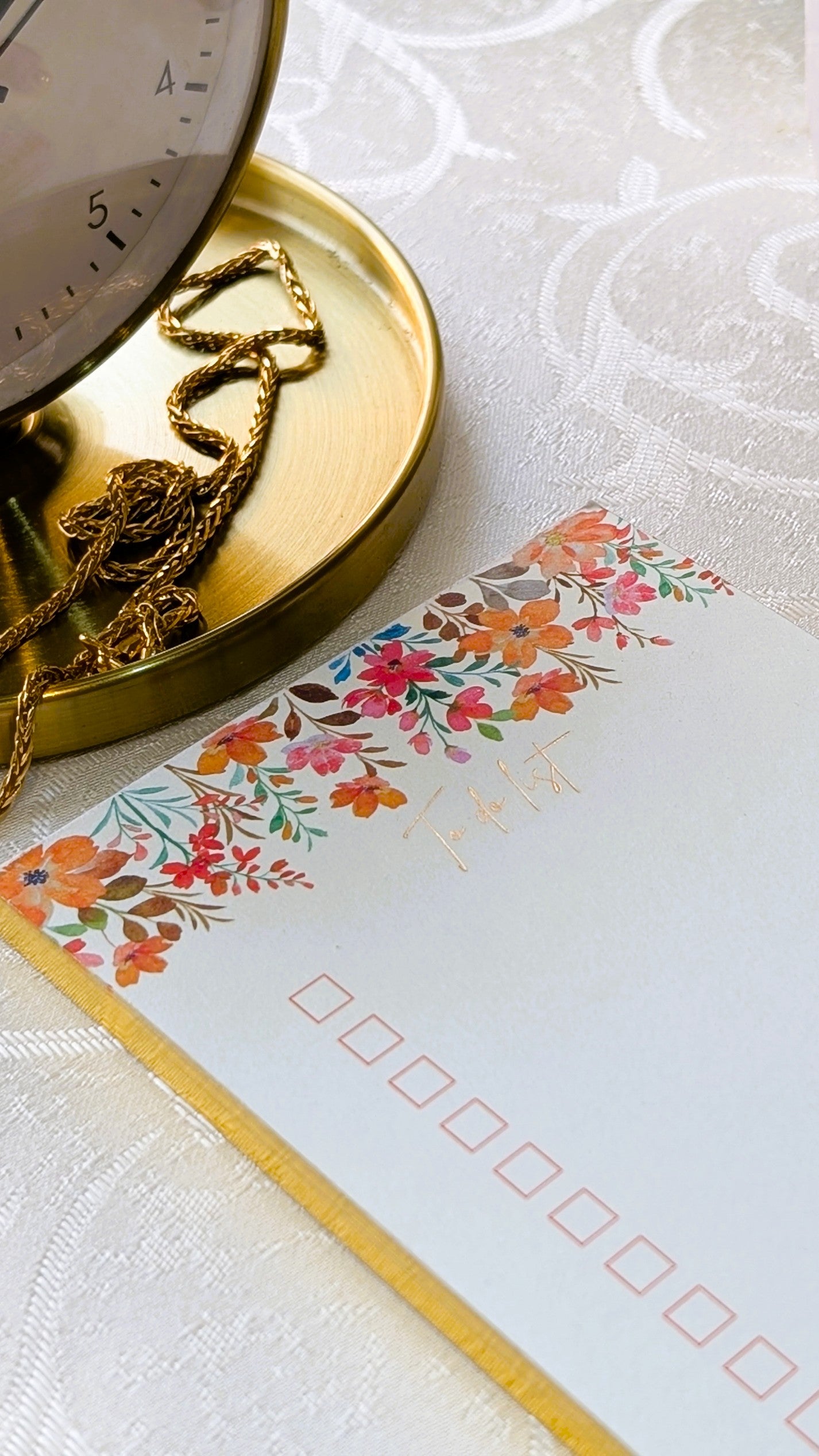 Made with 120 gsm high-quality, cream-colored paper, each page of this to-do list pad is adorned with our unique floral and foliage design. The glue bound pad comprises of 50 sheets with check boxes and gold foil text. The gilded edges add to the charm of this already exquisite piece to ensure that functionality is not devoid of beauty.
